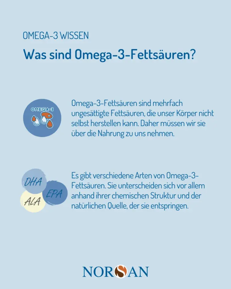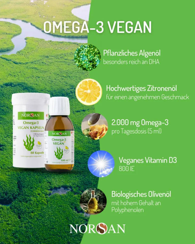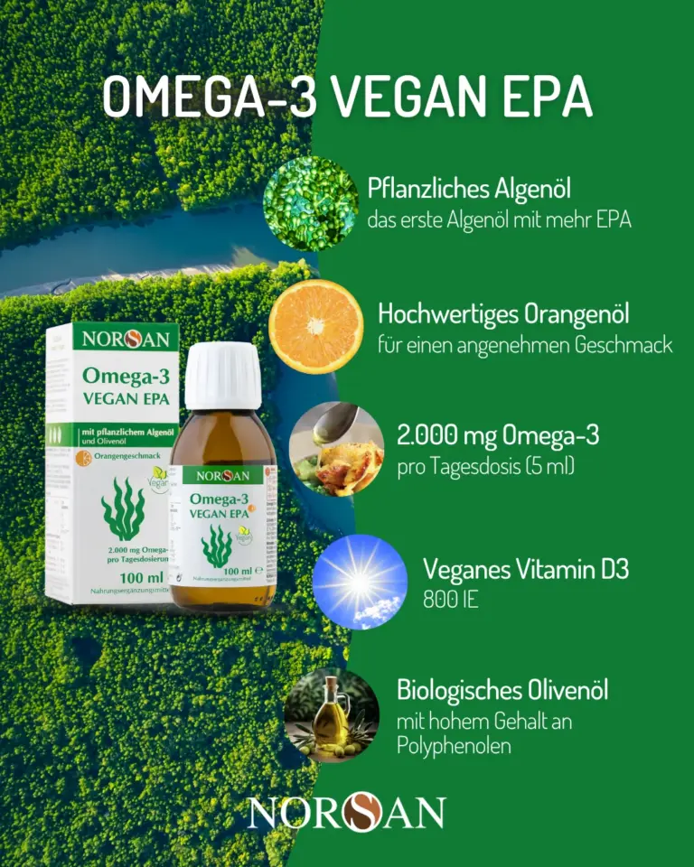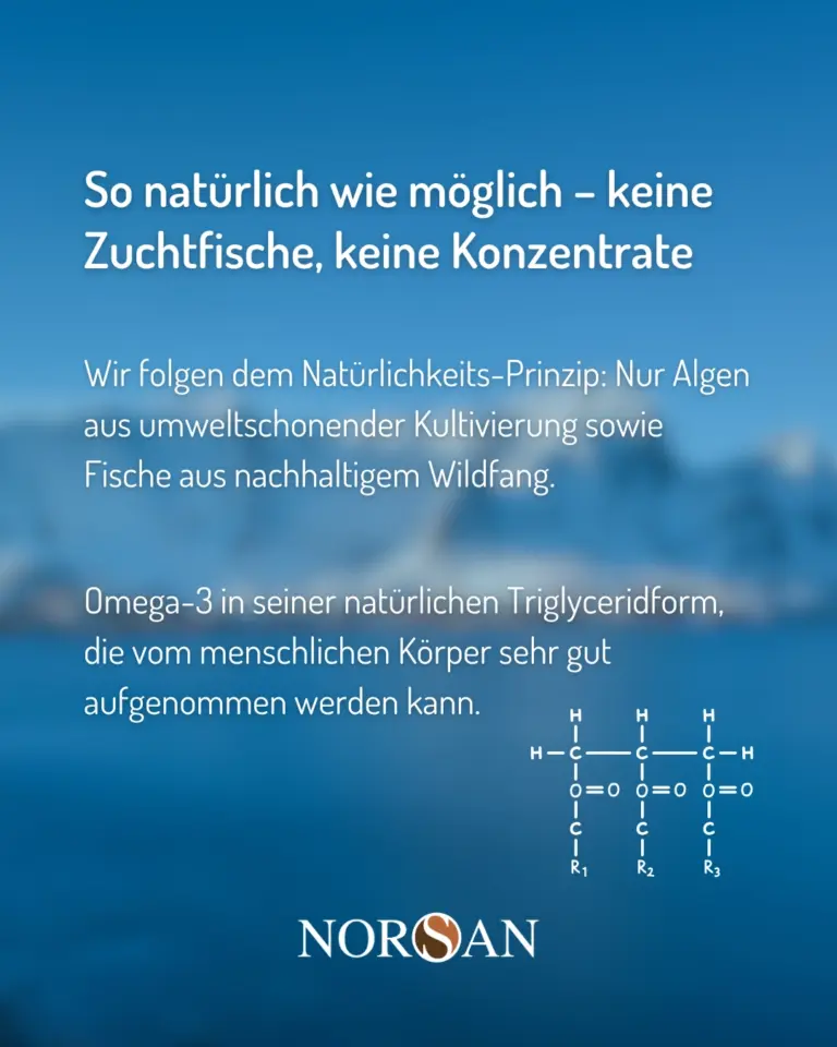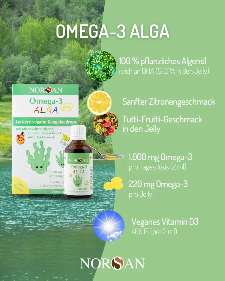 Bei NORSAN stammen diese Omega-3-Fettsäuren aus Algenöl. Algen sind eine natürliche, pflanzliche Quelle von DHA und EPA – also genau die Formen, die Ihr Körper braucht und sonst vor allem aus Fischölen erhält.