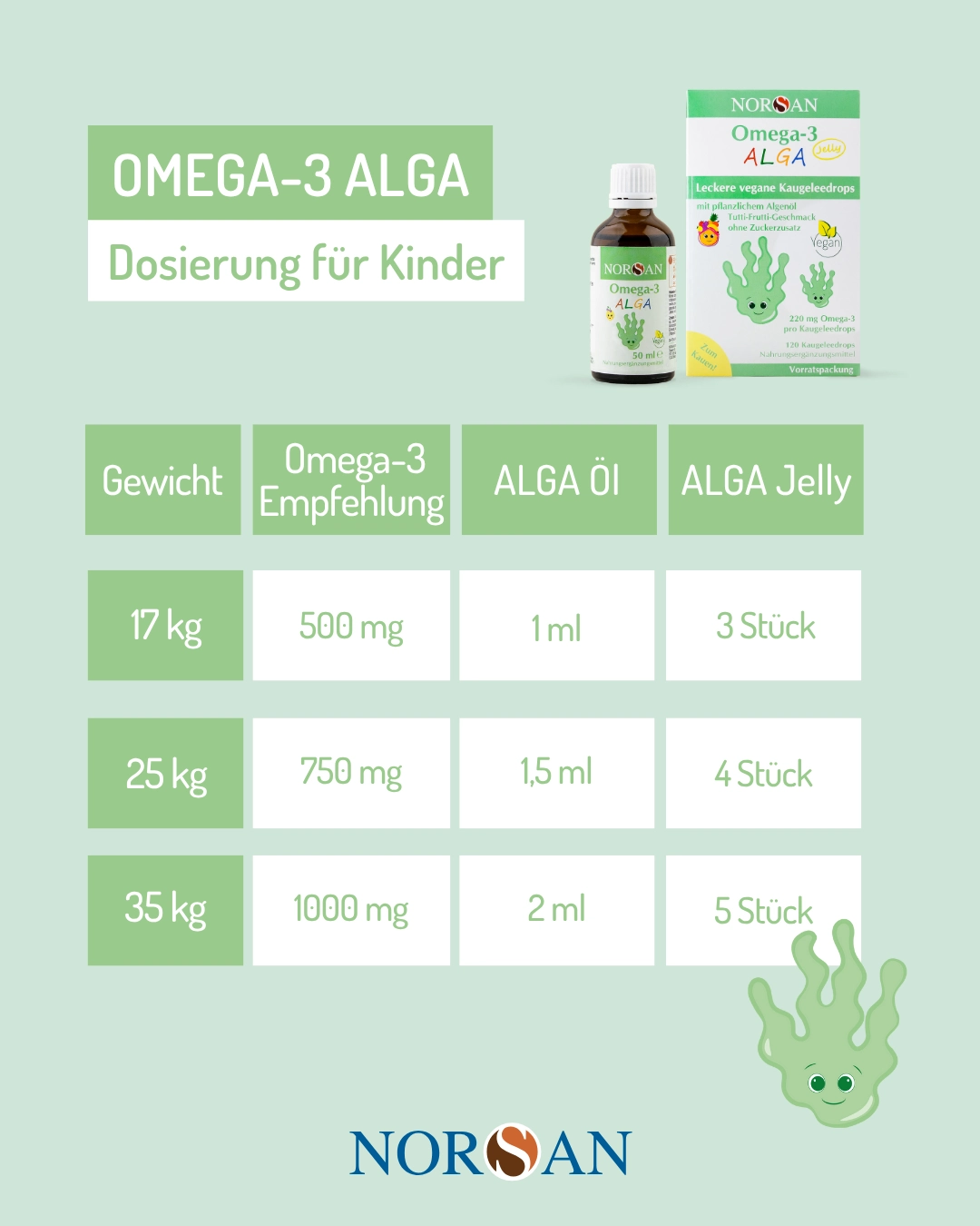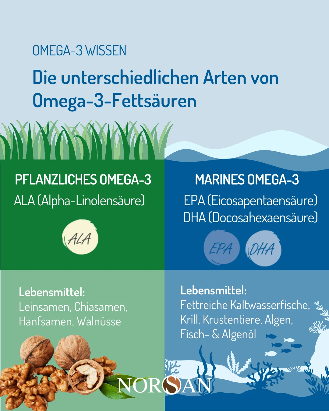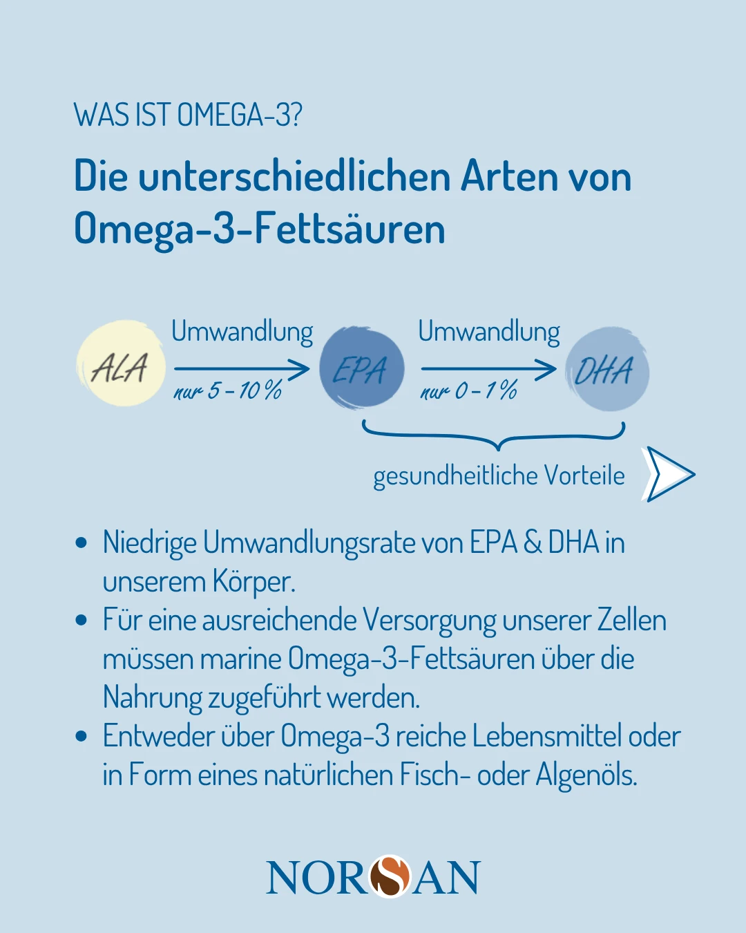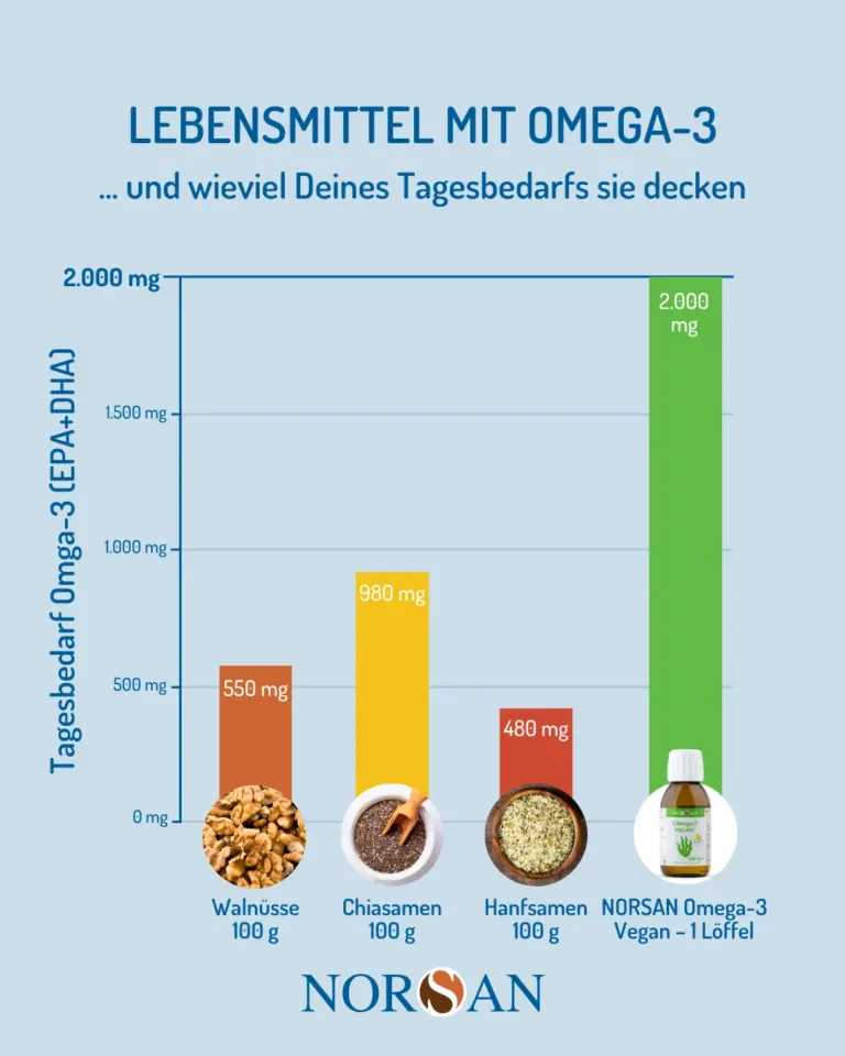 Bei NORSAN stammen diese Omega-3-Fettsäuren aus Algenöl. Algen sind eine natürliche, pflanzliche Quelle von DHA und EPA – also genau die Formen, die Ihr Körper braucht und sonst vor allem aus Fischölen erhält.