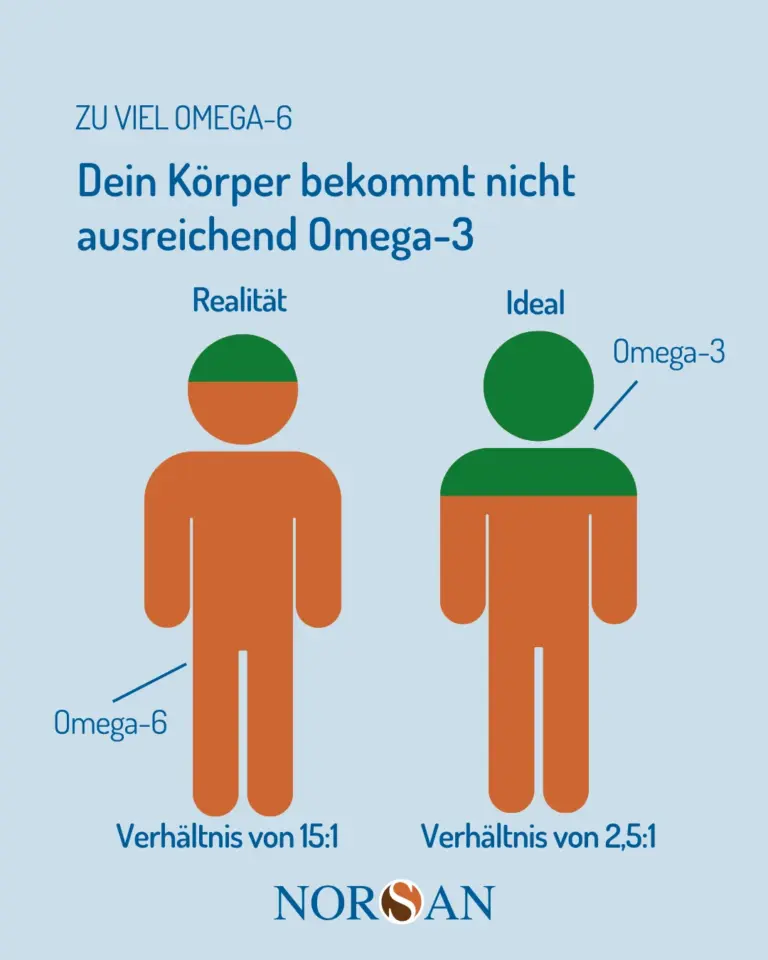 - Viele Menschen haben ein unausgewogenes Verhältnis von Omega-3 zu 6-Fettsäuren (häufig 15:1 oder höher statt ideal unter 5:1).