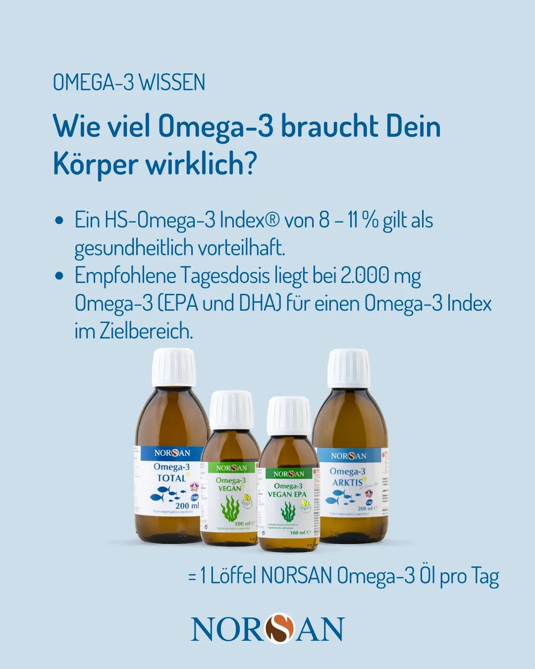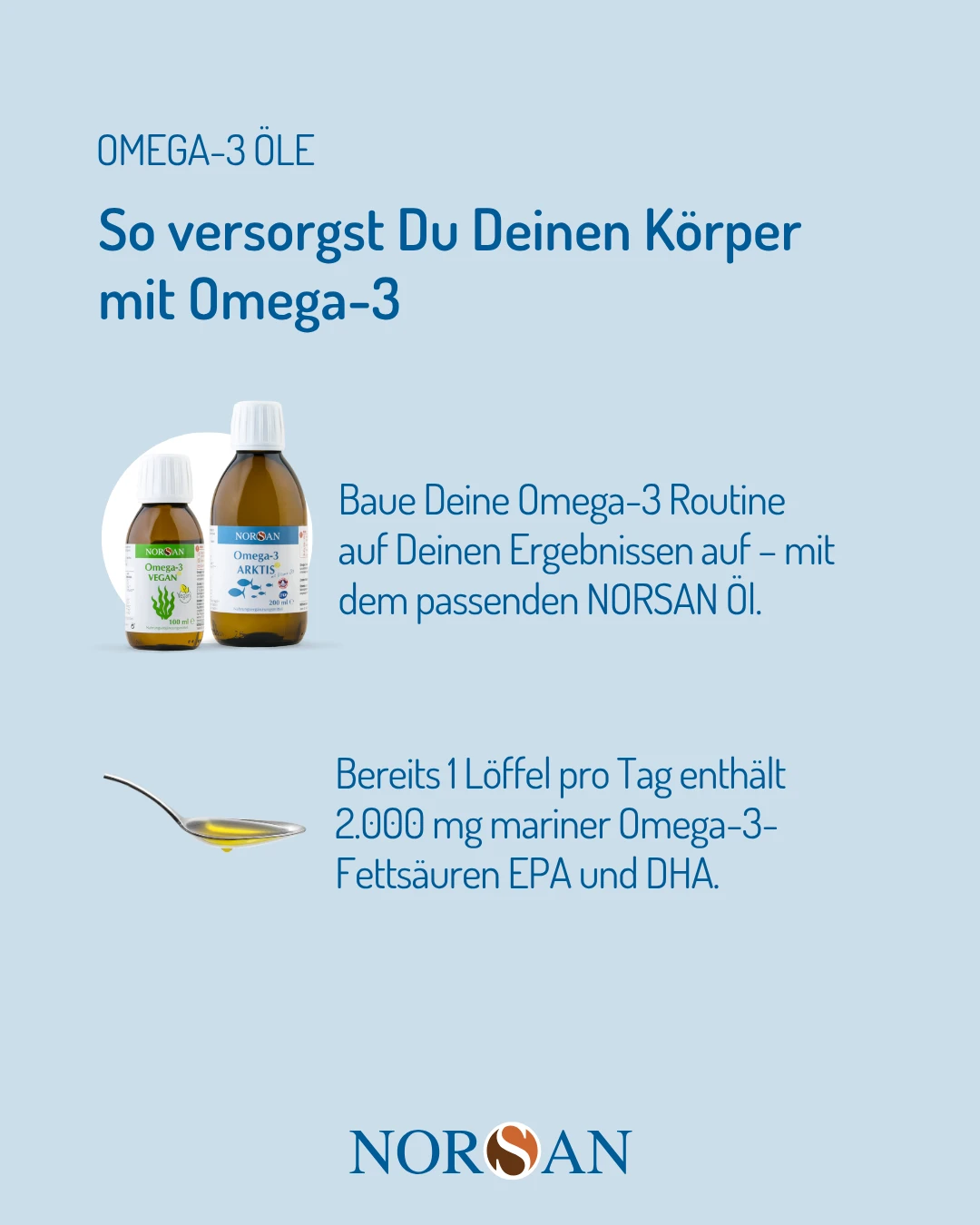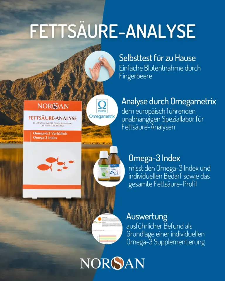 Ein Fettsäure-Test zeigt Ihnen objektiv, ob Ihre aktuelle Versorgung ausreicht oder ob eine gezielte Ergänzung – z. B. mit einem hochwertigen Omega-3-Öl von NORSAN – sinnvoll ist.