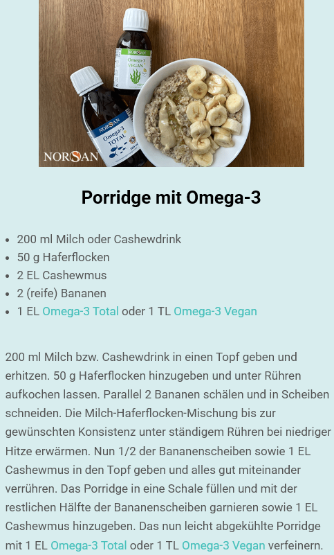 Hier finden Sie ein Beispiel-Rezept für ein Omega-3-Porridge und hier eine Infografik zur richtigen Dosierung – so wird die Einnahme einfach, alltagstauglich und optimal abgestimmt.